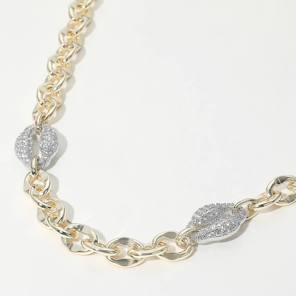 14K Gold Plated Two Tone CZ Stone Paved Link Accent Chunky Chain Necklace