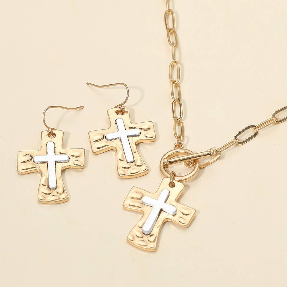This elegant jewelry set includes a link chain necklace with a cross pendant and matching drop earrings. The hammered detailing enhances its unique charm, making it a versatile accessory for casual wear or special occasions, adding a stylish and meaningful touch to your look.
